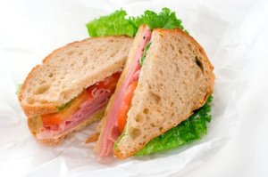 Two halves of Black Forest Ham and Cheddar Cheese sandwhich on white deli sandwich paper. Shallow dof.