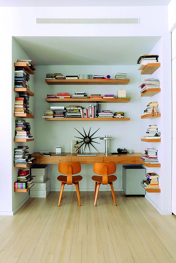 The shelves in the office space are custom made perfectly matching the two Eames chairs below.